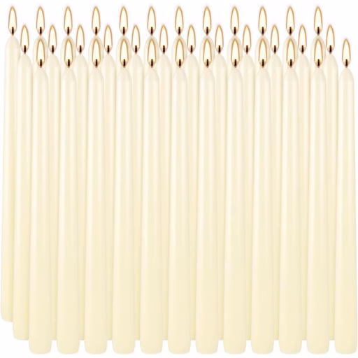 - Set of 36 ivory taper candles, each 10″ tall and 0.8″ in diameter