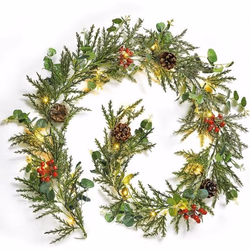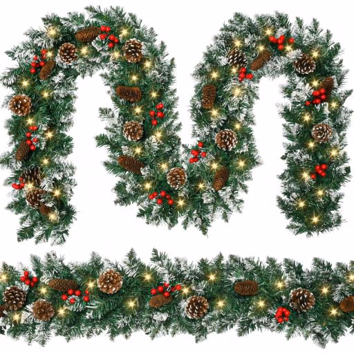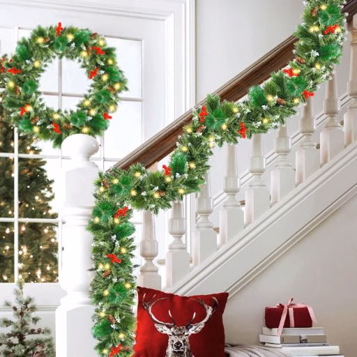 This 9-foot Christmas garland from Beinhome strikes a beautiful balance between rustic charm and seasonal elegance. With a blend of 220 thick greenery tips, pine cones, red berries, and soft LED lighting, it’s an ideal piece for enhancing mantels, stair rails, or entryways. The battery-operated design and included timer make this pre-lit Christmas garland both stylish and hassle-free for indoor or covered outdoor use.