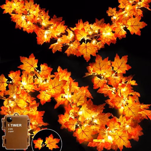 This 2-pack of artificial fall garlands by TURNMEON brings autumn indoors with rich, warm tones and a gentle glow. Each garland measures 6.5 feet and features 40 LED lights embedded within double-layered maple leaves. Thoughtfully designed with both aesthetics and function in mind, these battery-operated garlands include a convenient timer setting—making them ideal for mantels, staircases, entryways, or Thanksgiving tablescapes.