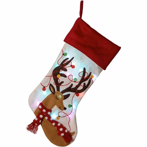 Festive and full of charm, this handcrafted stocking by Glitzhome blends traditional holiday style with playful LED sparkle. Featuring a detailed reindeer design embroidered onto a soft linen-textured fabric, it lights up your space with warmth and whimsy. Ideal for fireplaces or bedroom doors, this light-up Christmas stocking captures the spirit of the season while adding a personal, cozy touch to your décor.