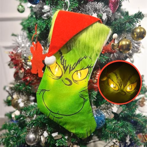 This festive stocking from ULTHOOL brings classic holiday colors to life with a playful LED twist. Compact yet roomy, it features bright red and green tones and cleverly hidden LED lights in the eyes, creating a delightful glow when powered on. Whether you’re decorating a child’s room, a themed tree, or the family mantel, this stocking adds just the right touch of light-hearted cheer to your Christmas setup.