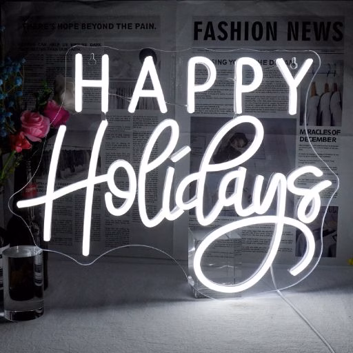 - LED neon lighting with “Happy Holidays” design