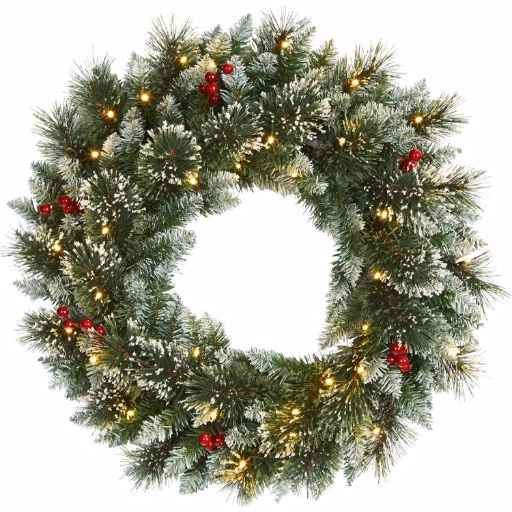 Nearly Natural 24in Frosted Swiss Pine Pre-Lit Christmas Wreath with Berries
