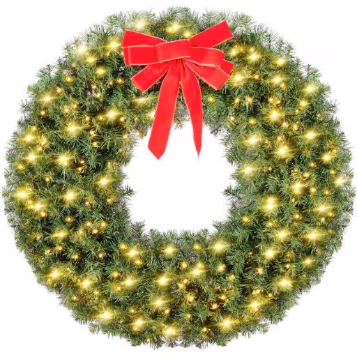 With its commanding size and classic charm, this 48-inch outdoor Christmas wreath with lights offers a stunning welcome to the holiday season. The wreath comes pre-lit with 250 warm white LED lights and a glowing red bow that instantly elevates any door, wall, or gate it adorns. Constructed with 714 easy-to-shape PVC tips, it provides a full, lifelike appearance that looks festive day or night.