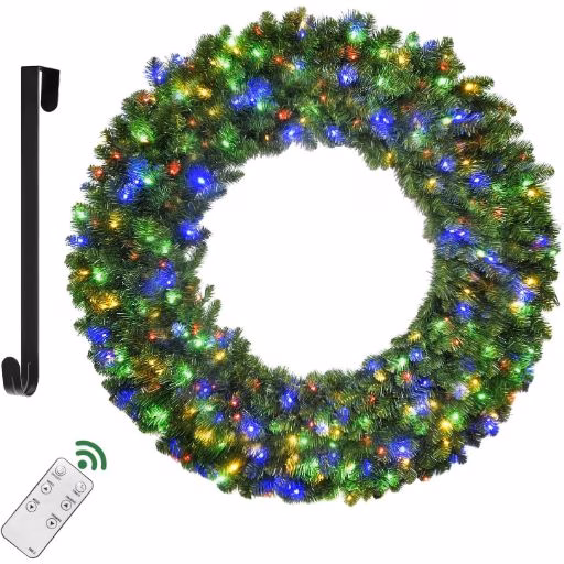 If you’re searching for outdoor Christmas wreaths with lights that truly light up your home in more ways than one, this 48-inch wreath from HOYECHI is a showstopper. With its full silhouette made up of 714 lush PVC tips and a dazzling display of 210 colorful LEDs, it transforms any exterior into a holiday spectacle. Whether mounted above a garage, on a front door, or over a large window, this wreath balances festive charm with durability.
