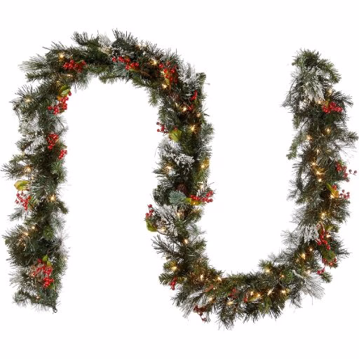The National Tree Company’s 9ft Wintry Pine Garland brings the charm of a winter forest indoors, featuring lush, flocked greenery adorned with pinecones, red berries, and 100 clear incandescent lights. With 184 hand-crafted branch tips, this garland has a rich, full look that creates an instant festive feel across mantels, doorways, or railings. Designed for durability and safety, it’s built with flame-resistant, hypoallergenic materials and is suited for both indoor and covered outdoor use.