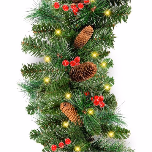 This 9ft pre-lit Christmas garland from Best Choice Products is a festive essential that blends a traditional holiday look with modern convenience. Pre-decorated with pinecones, red berries, and 50 warm white LED lights, this garland adds an elegant, natural touch to staircases, fireplaces, and door frames. Made with durable, flame-retardant PVC branches and a built-in stackable plug, it’s perfect for connecting multiple strands to brighten up larger spaces.