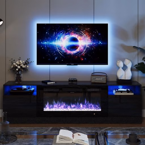 - Best Dual-Use Unit: oneinmil Fireplace TV Stand (70″) – Combines storage and ambiance with a 36” fireplace insert.