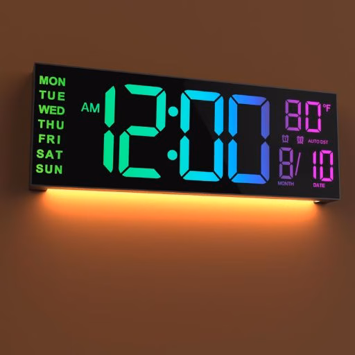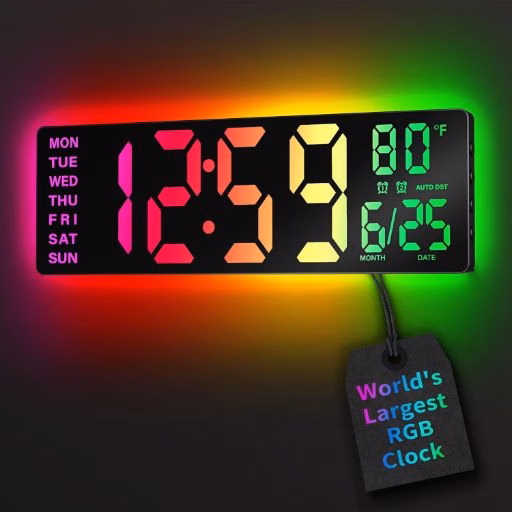 For those who love mixing vibrant visuals with smart functionality, the EASYERA 16.5″ Digital Wall Clock is a standout. With its massive LED display, 11 RGB lighting modes, and intuitive remote control, it’s more than just a timekeeper—it’s a mood-enhancing centerpiece. Whether it’s brightening up a classroom, elevating a gaming setup, or keeping time in a shared home space, this clock delivers visibility, control, and a touch of fun.