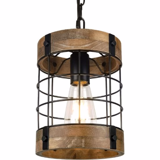 - 1-light drum-style pendant with wood-finished frame and black iron cage